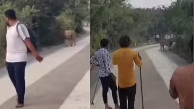 श्रद्धालुओं के पीछे आराम से चलता दिखा शेर